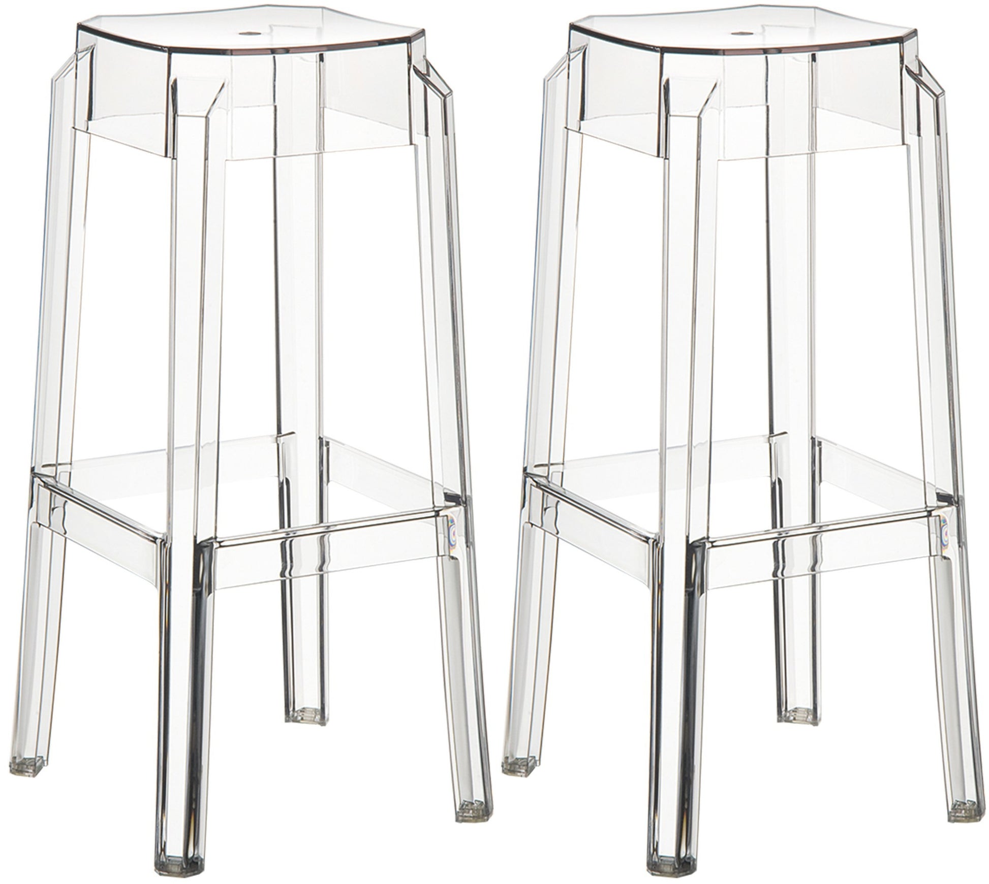 Mit einer Sitzhöhe von 75 cm und einer umlaufenden Fußstütze bieten sie besonderen Komfort. Die Tresenhocker sind stapelbar, sodass sie sich platzsparend verstauen lassen. Die Hocker bestehen entweder aus hochwertigem, glänzendem Nylon oder aus klarem, transparentem Polycarbonat.