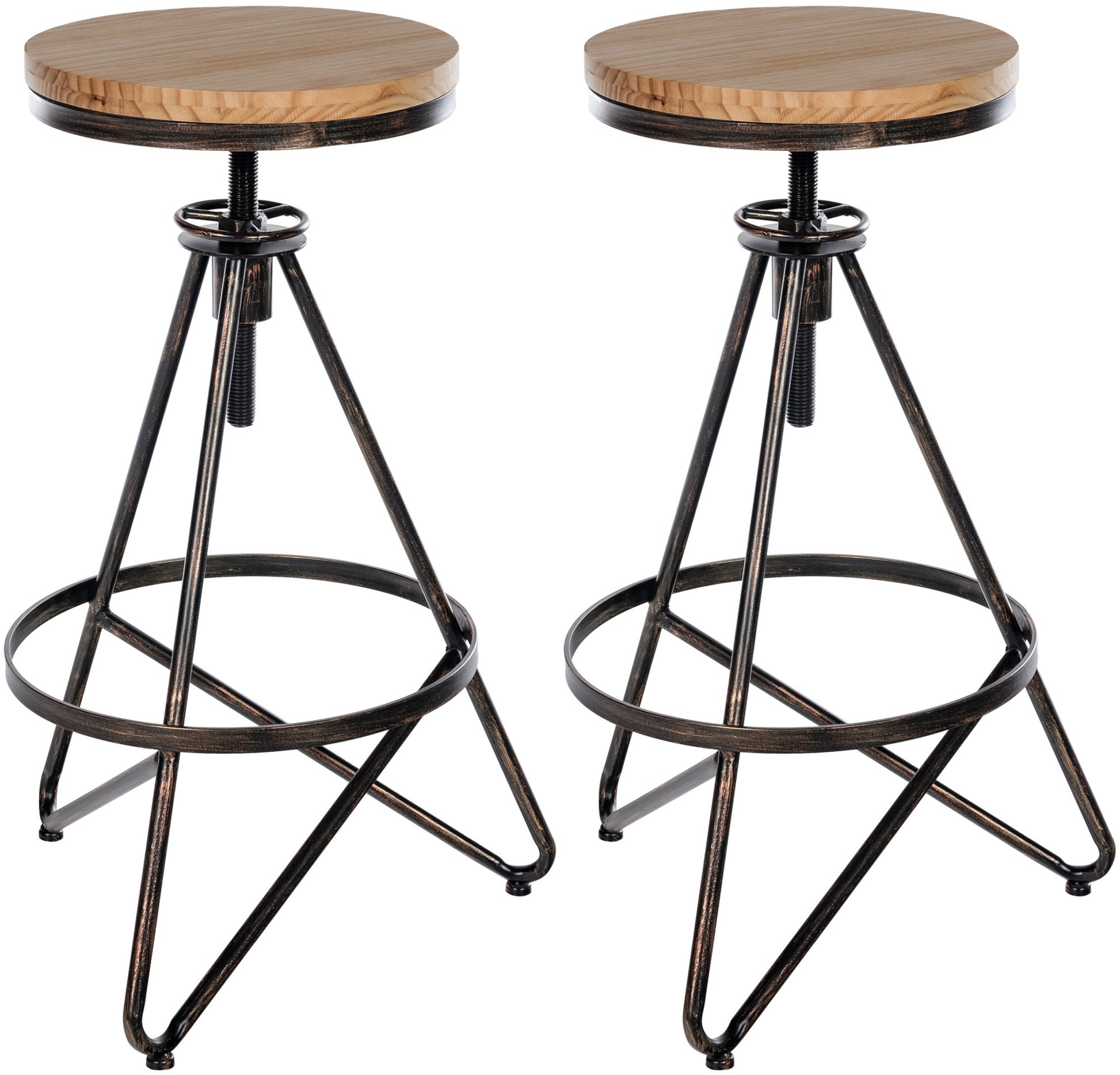 Die Kombination aus robuster Sitzfläche aus massivem Eschenholz und Metallgestell mit patinierter Oberfläche verleiht diesen Barstühlen eine markante Optik. Dank der praktischen Höhenverstellung lassen sich die Thekenhocker flexibel an verschiedene Tischhöhen anpassen. Durch Drehen an der Sitzfläche können die Sitzhöhen so von 67 bis 81 Zentimeter eingestellt werden.