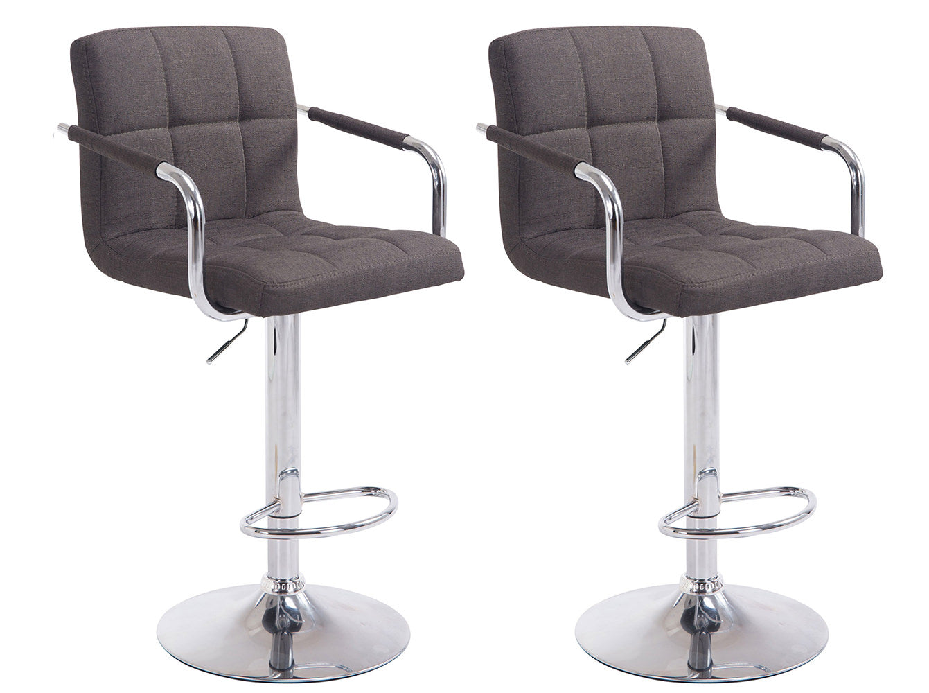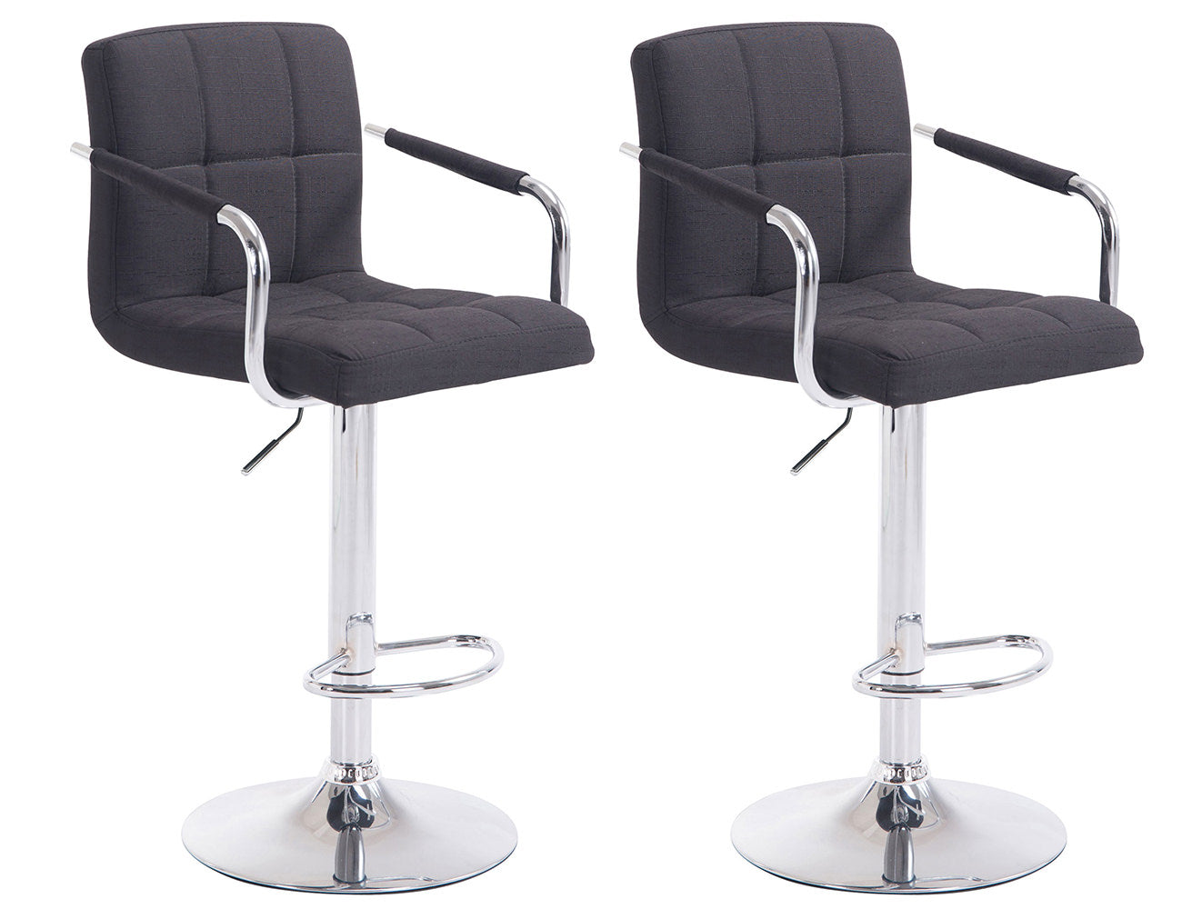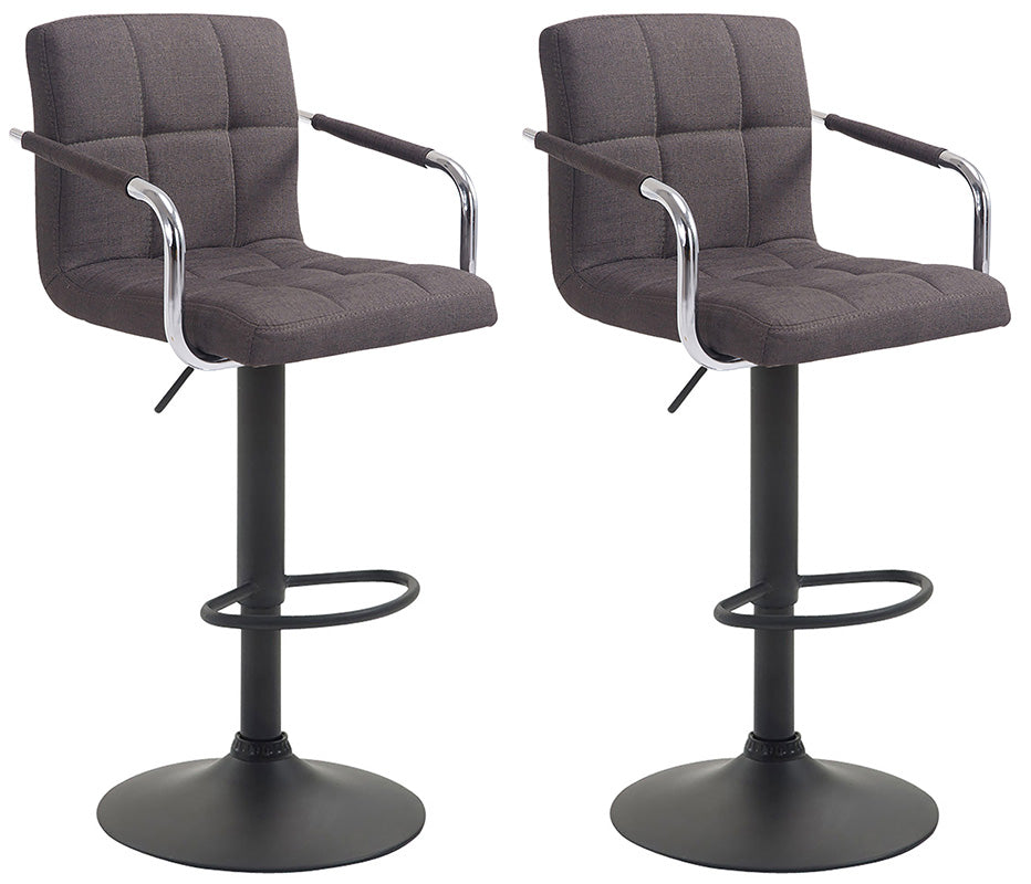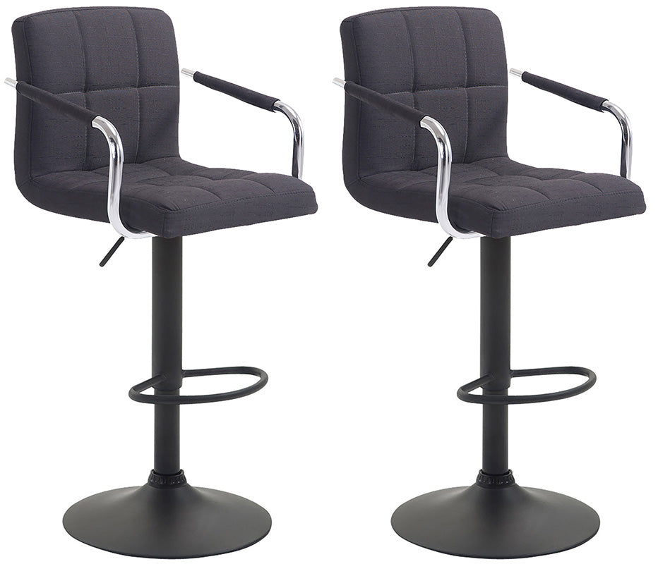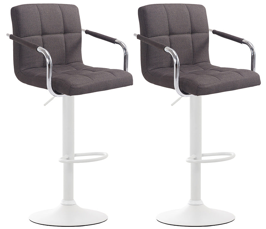 Im zeitlosen Design fügt sich dieses moderne Barhocker Set gerne in jeden Raum ein. Seine bequeme Polsterung wird durch moderne Rückenlehnen, Armlehnen und ergonomische Fußstützen ergänzt. Ein schönes Detail sind stilvollen Ziernähten der mit Stoff bezogenen Polsterung. Um 360° drehbare Sitzflächen sorgen rundum für Gemütlichkeit. Zudem sind sie mittels eines Gaslifts stufenlos höhenverstellbar und dadurch für jede Thekenhöhe bestens geeignet.