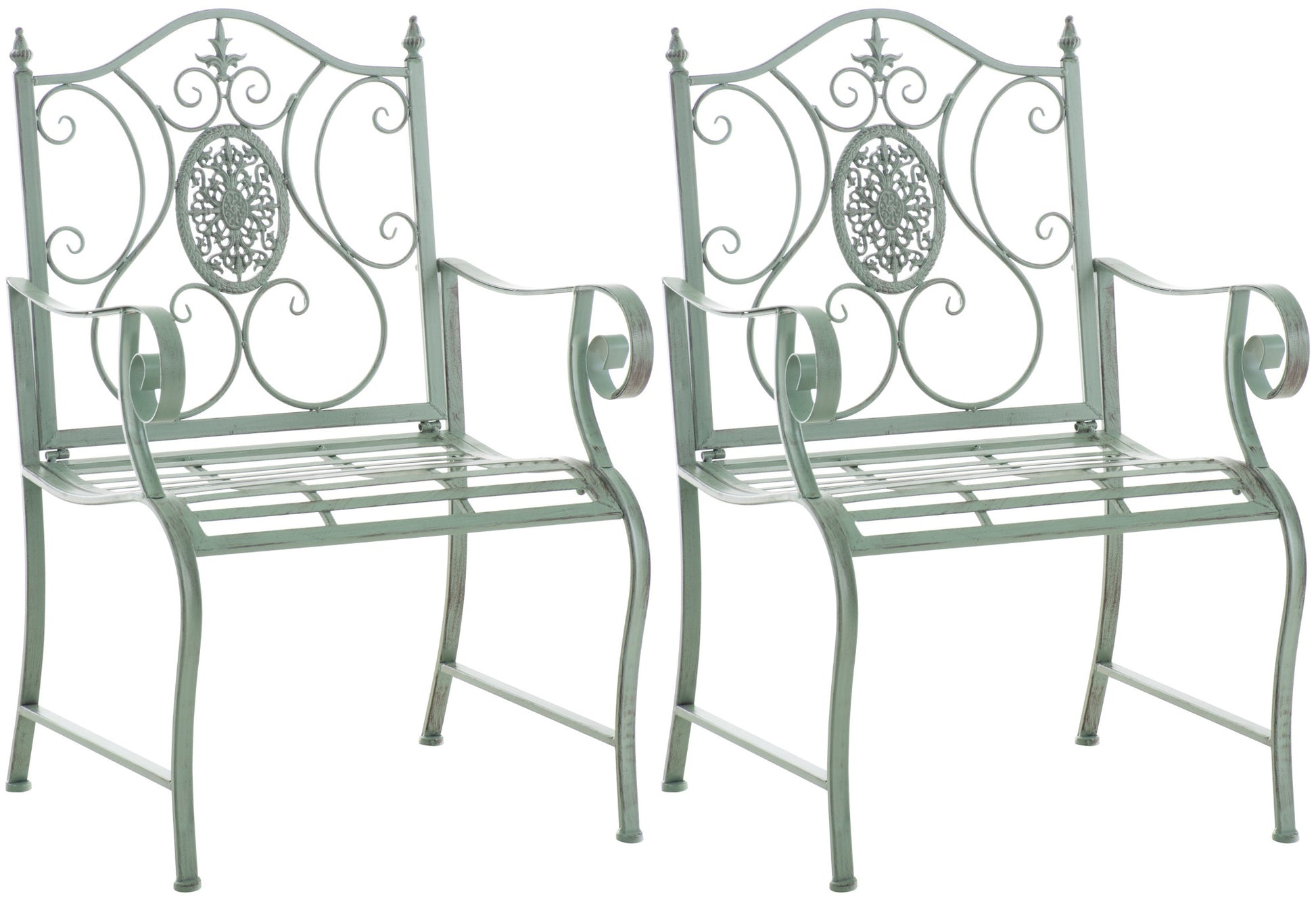 Die Stühle bestehen aus lackiertem Eisen. Dabei sind die Eisenstühle pflegeleicht und können mit einem feuchten Tuch und mildem Spülmittel gereinigt werden. Die Oberflächen der Gartenstühle sind mit einer schönen Patina veredelt, passend zu den schönen Verzierungen. Vor direkten Witterungseinflüssen sollten die Gartensessel geschützt werden.