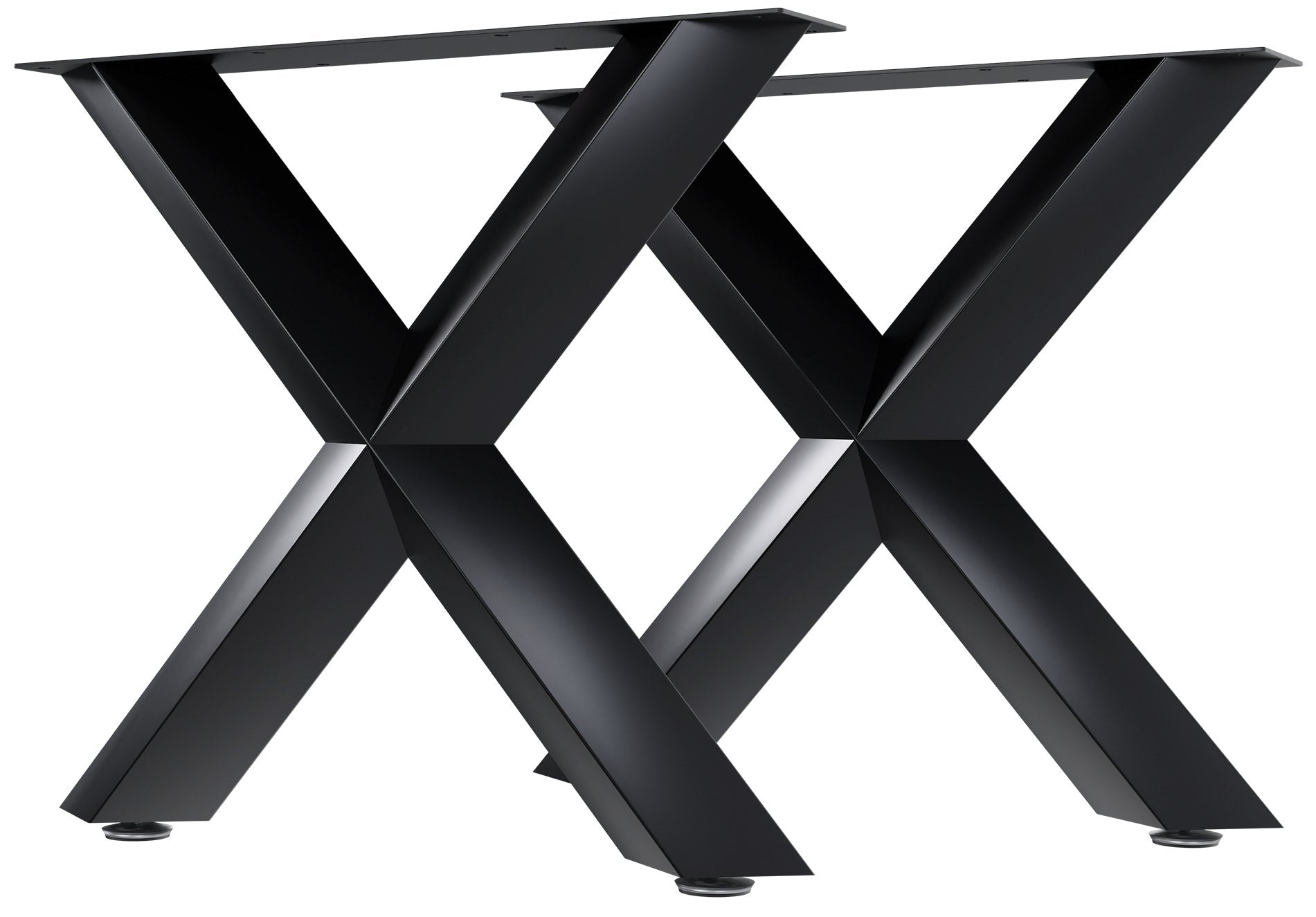 Das Set aus zwei kreuzförmigen Tischbeinen Stanton präsentiert sich im zeitgemäßen Industrial-Stil, geformt aus robustem, pulverbeschichtetem schwarzem Metall.