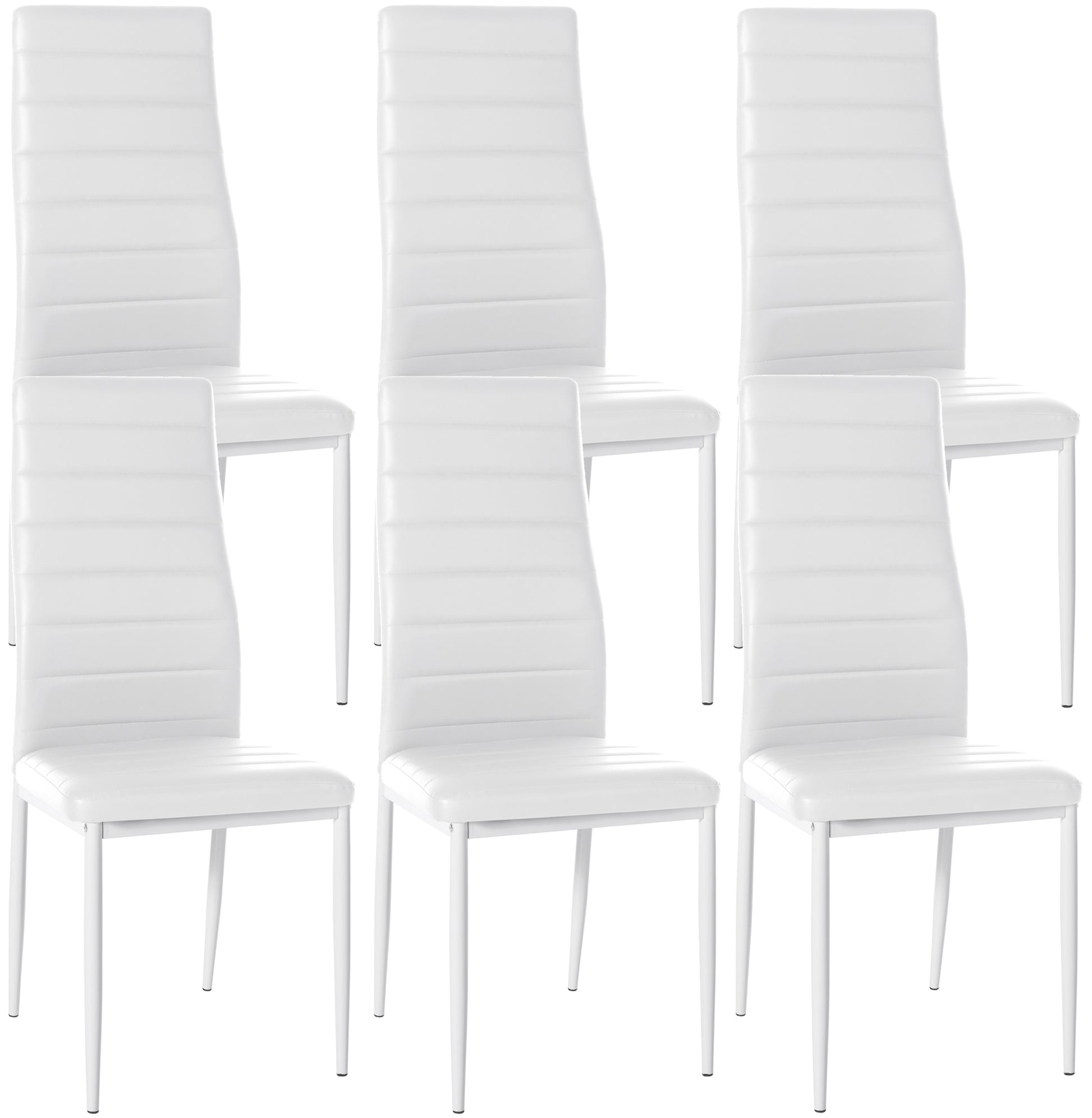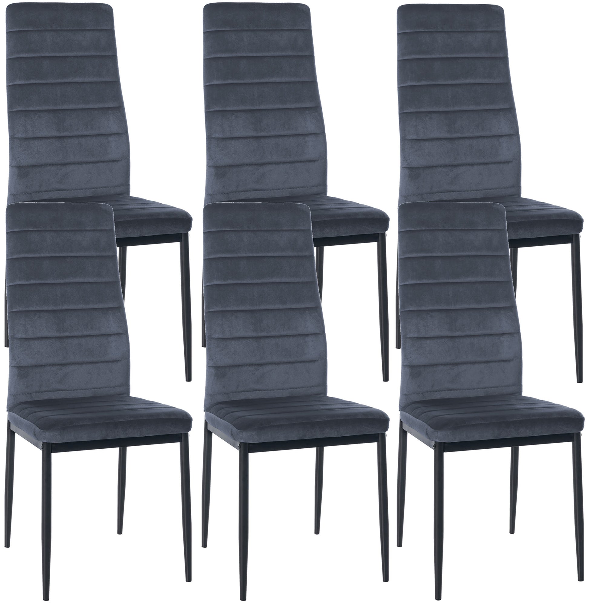 Das 6er Set Esszimmerstühle Mayfair mit Samtbezug oder mit Kunstlederbezug bereichert wohnlich moderne Räumlichkeiten perfekt und zieht in jedem Raum die Blicke auf sich. Die hohe Rückenlehne und die angenehme und komfortable Polsterung ermöglichen ein bequemes Sitzen auch über einen längeren Zeitraum hinaus. Dabei steht dieser Lehnstuhl stabil und standsicher auf einem Vierfußgestell aus Metall. Ausgestattet mit Bodenschonern unter den Füßen, werden Kratzer und Beschädigungen am Boden verhindert. Des Weiteren ist der Esszimmerstuhl dank der pflegeleichten Materialien jederzeit schnell und einfach zu reinigen.