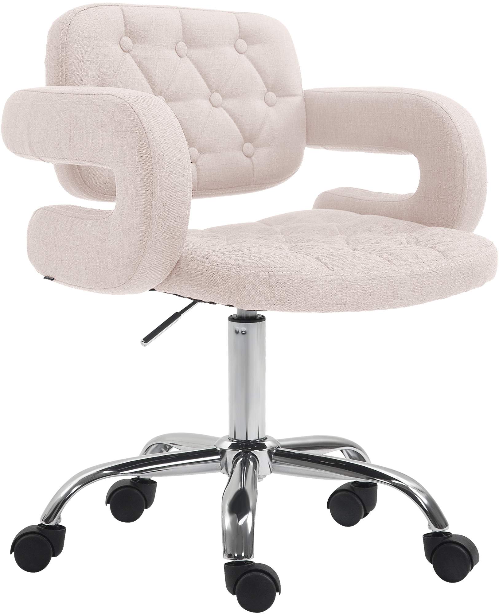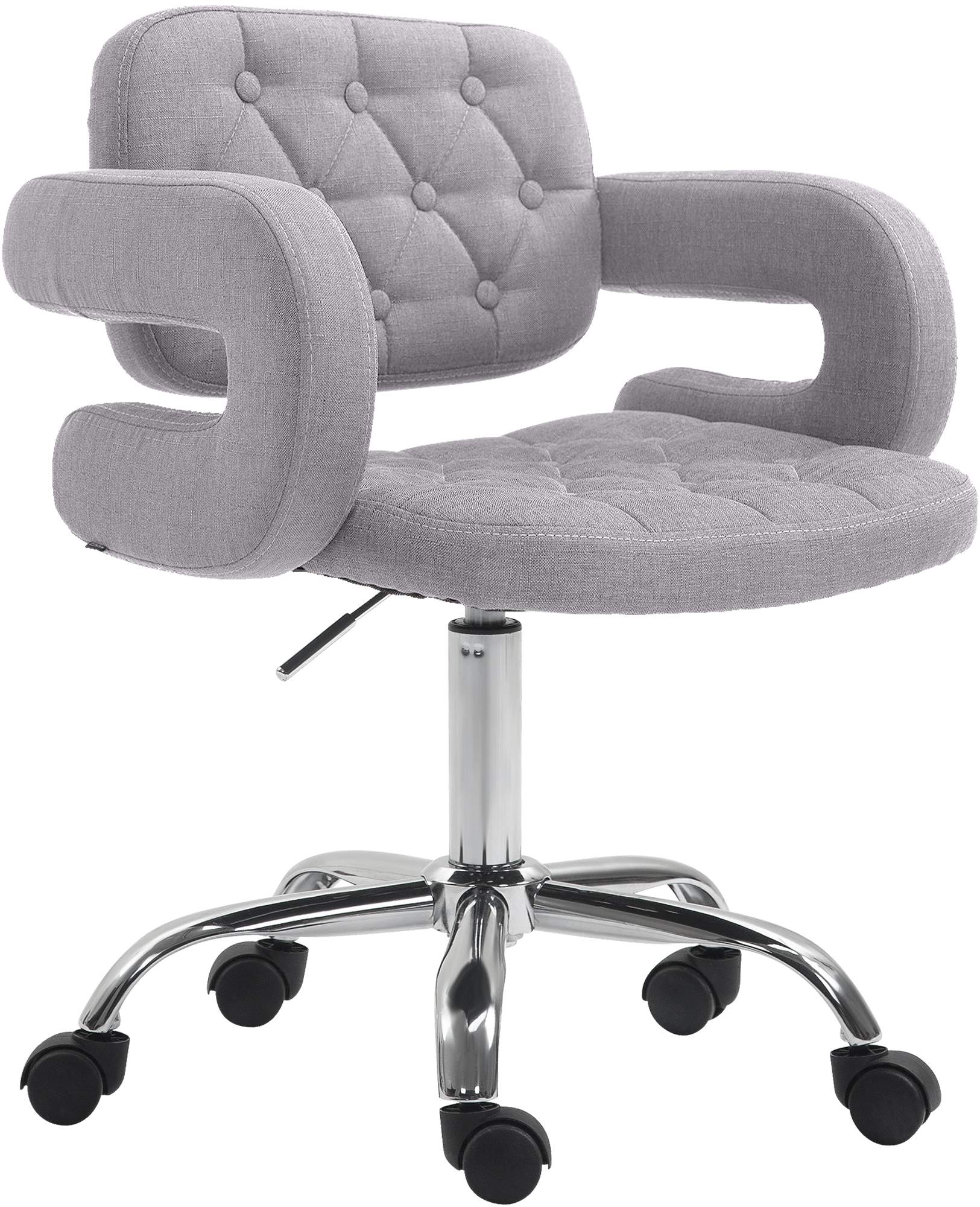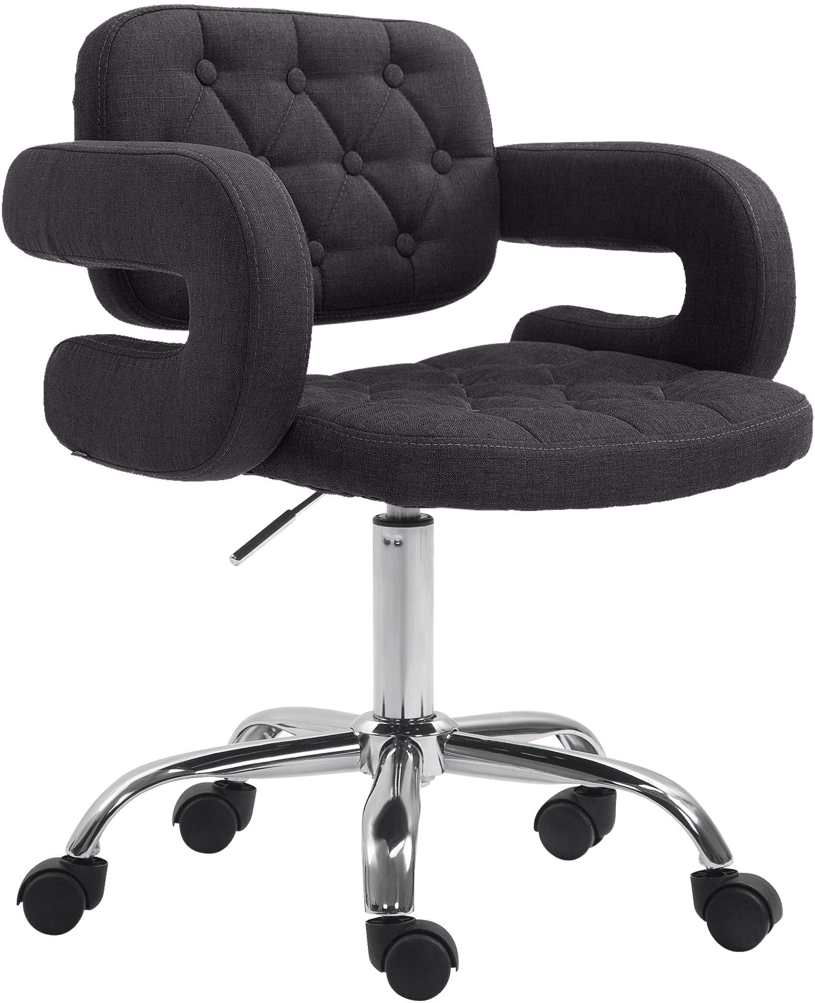 Mit geschwungenen Armlehnen und einer Rückenlehne für den unteren Rückenbereich bietet er komfortable Unterstützung insbesondere für den unteren Rückenbereich. Dabei steht der Stuhl auf einem stabilen Fußkreuz aus Metall in Chrom-Optik. Dieses ist mit Leichtlaufrollen ausgestattet, welche für Teppichböden und für Hartböden geeignet sind.