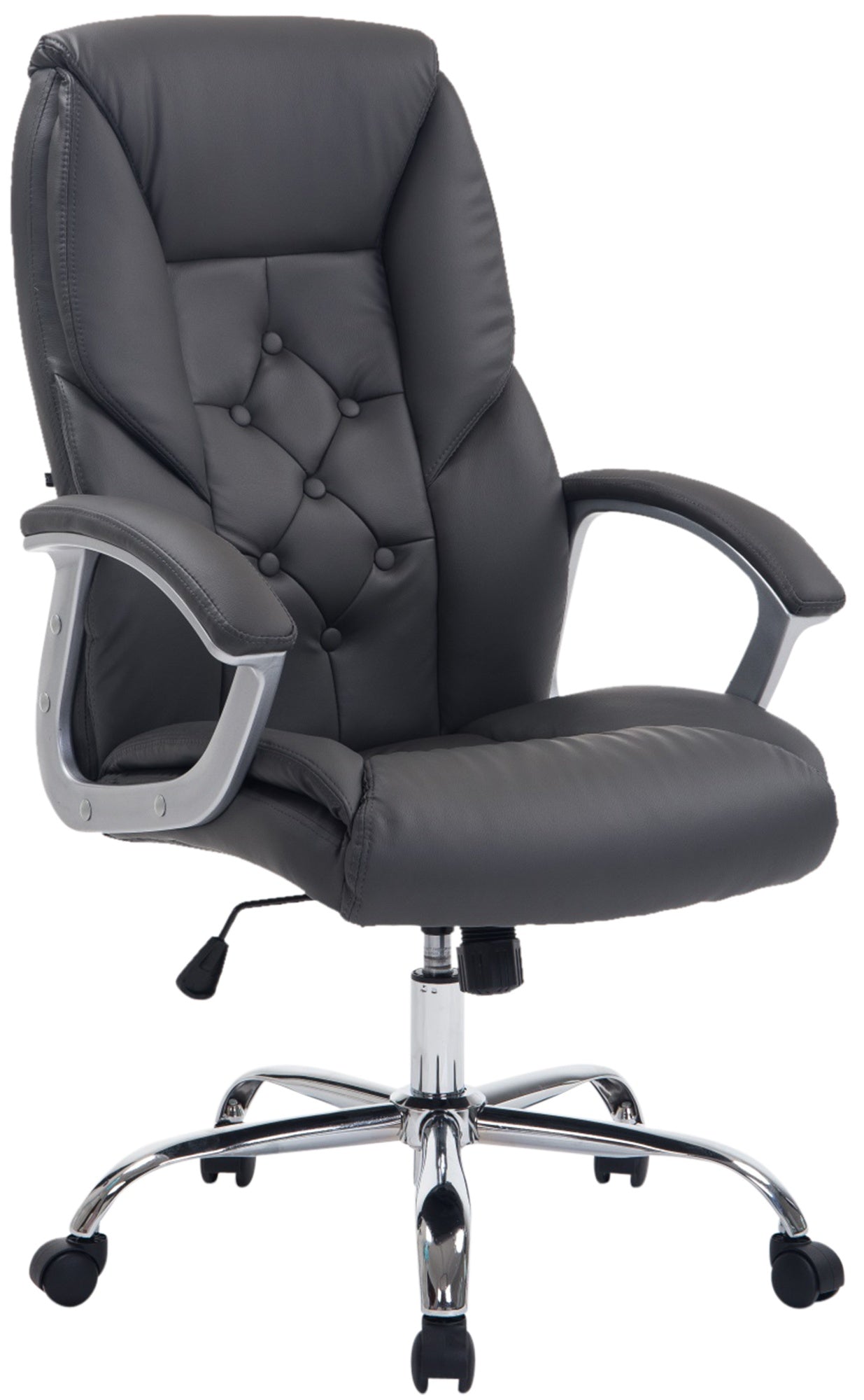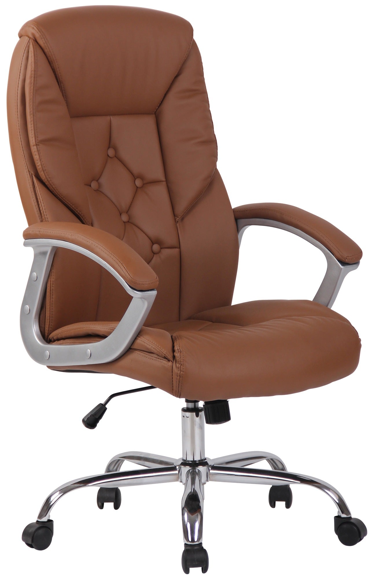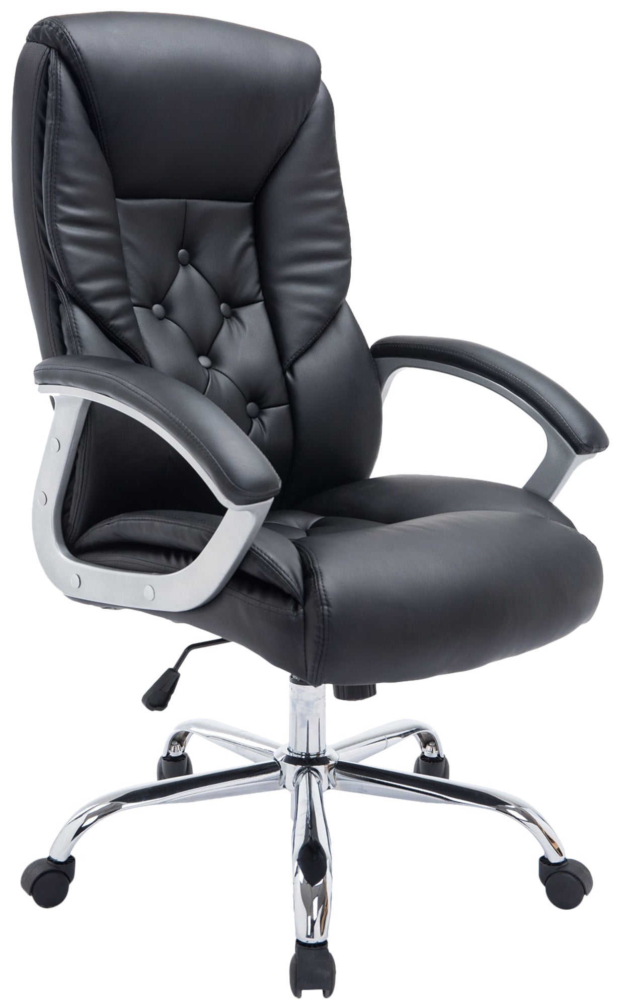 Dieser Bürostuhl ist ideal für große und schwere Personen geeignet, da die Gasdruckfeder auf einen dauerhaften Gebrauch bis zu 210 kg ausgerichtet ist. Der Chefsessel Rodeo ist ein exklusiver Bürostuhl mit einer sehr hochwertigen Polsterung und Kunstlederbezug. Kunstlederbezüge haben den Vorteil, dass sie elastisch sind und sich bei Entlastung wieder glatt ziehen. Dies sieht nicht nur schöner aus, sondern erhöht zusätzlich die Lebensdauer des Sitzbezuges. Das Gestell ist aus Metall in Chromoptik und dadurch sehr stabil. Dank der verstellbaren Sitzhöhe und den angenehm gepolsterten Armlehnen ist ergonomisches Sitzen garantiert. Die Sitzhöhe ist mit dem Hebel unter dem Sitz stufenlos verstellbar. Die stilvollen Zierknöpfe an der Rückenlehne und auf der Sitzfläche tragen zum edlen Design bei. Der eingebaute Wippmechanismus sorgt für mehr Bewegungsfreiheit. Der Bürostuhl steht standsicher auf fünf Leichtlaufrollen.