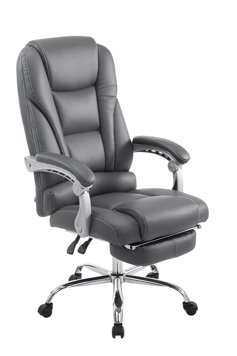 Dieser eindrucksvolle Bürostuhl Pacific überzeugt nicht nur mit seinem edlen Look, auch in Sachen Komfort und Belastbarkeit kann ihm keiner etwas vormachen. Seine gute Polsterung und der pflegeleichte Kunstlederbezug mit stilvollen Ziernähten sorgen dabei für ein angenehmes Sitzgefühl, auch bei längerer Verweildauer. Dank der stufenlos verstellbaren Sitzhöhe garantiert der Bürostuhl Pacific zudem jederzeit ein ergonomisches Sitzen. Die leicht verstellbare Fußstütze und Rückenlehne sorgen zusätzlich für eine angenehme Pause zwischendurch, bei der sich entspannt zurückgelehnt werden darf und die Beine hochgelegt werden können. Dabei steht er standsicher auf fünf Leichtlaufrollen und einem Gestell aus Metall in Chromoptik. Egal ob Hart- oder Teppichböden - Sie werden immer leicht und locker über den Boden rollen können.