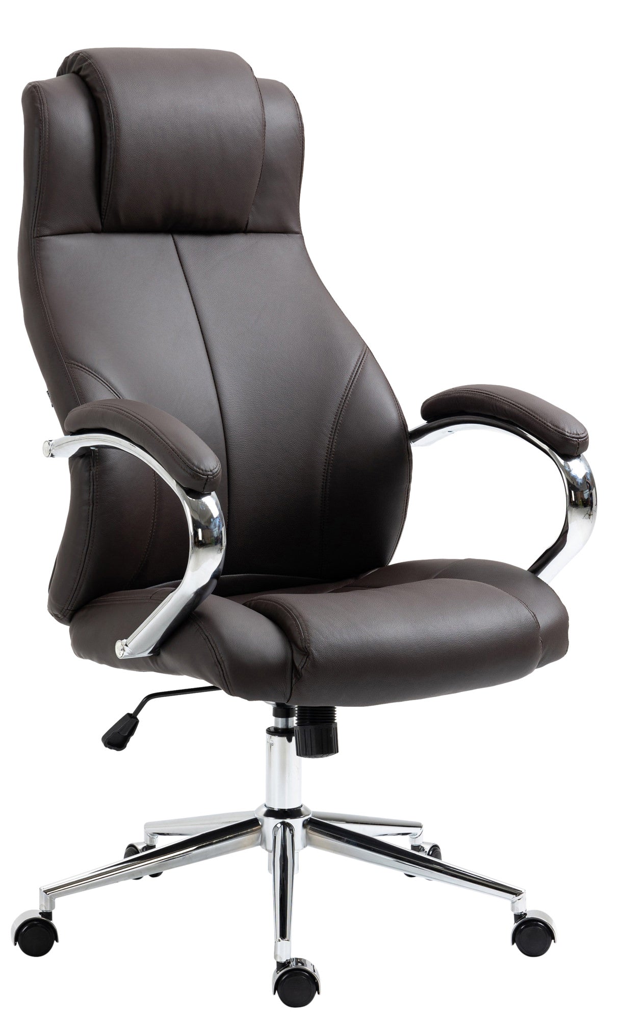 Die Polsterung ist mit einem Echtleder-Bezug aus langlebigem Rindsleder versehen und das Stuhlgestell besteht aus Metall in Chrom-Optik. Mit fünf beweglichen Leichtlaufrollen aus Kunststoff ermöglicht der Drehstuhl eine mühelose Bewegung im Arbeitsbereich.