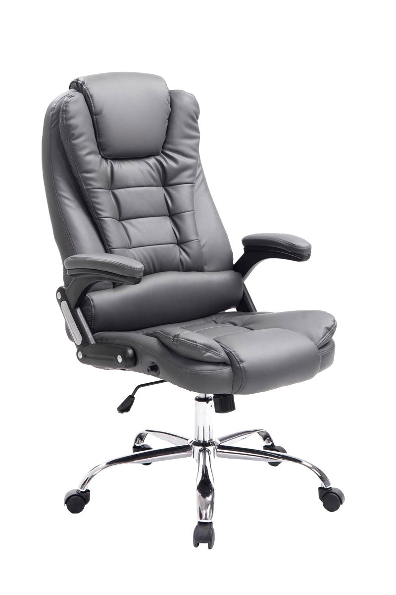 Der Chefsessel Thor ist ein exklusiver Bürostuhl mit einer sehr hochwertigen Polsterung und Kunstlederbezug. Kunstlederbezüge haben den Vorteil, dass sie elastisch sind und sich bei Entlastung wieder glatt ziehen. Dies sieht nicht nur schöner aus, sondern erhöht zusätzlich die Lebensdauer des Sitzbezuges. Das Gestell ist aus Metall in Chromoptik und dadurch sehr stabil. Dank der verstellbaren Sitzhöhe ist ergonomisches Sitzen garantiert. Die Sitzhöhe ist mit dem Hebel unter dem Sitz stufenlos verstellbar. Der eingebaute Wippmechanismus sorgt für mehr Bewegungsfreiheit.Der Bürostuhl steht standsicher auf fünf Leichtlaufrollen. Egal ob Hart- oder Teppichböden - Sie werden immer leicht und locker über den Boden rollen können.