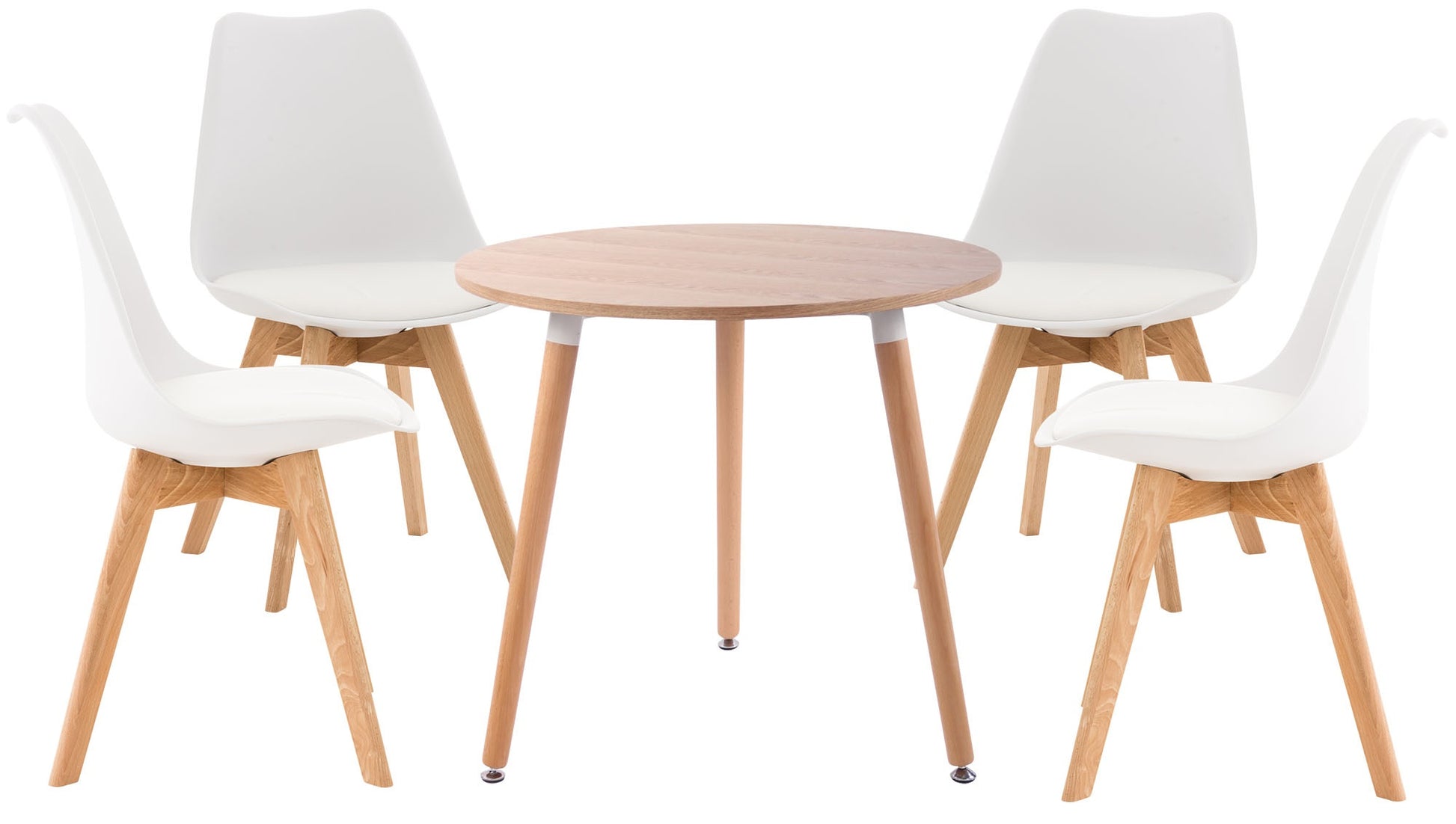 Die runde MDF-Tischplatte des Tischs Ansgar steht auf Tischbeinen aus Buchenholz. Die Sitzschale der vier Stühle Linares besteht aus stabilem Kunststoff und weist eine Lehne auf, die den Rücken entlastet. Für weiteren Komfort sorgt das Sitzpolster, das mit pflegeleichtem Kunstleder bezogen ist.
