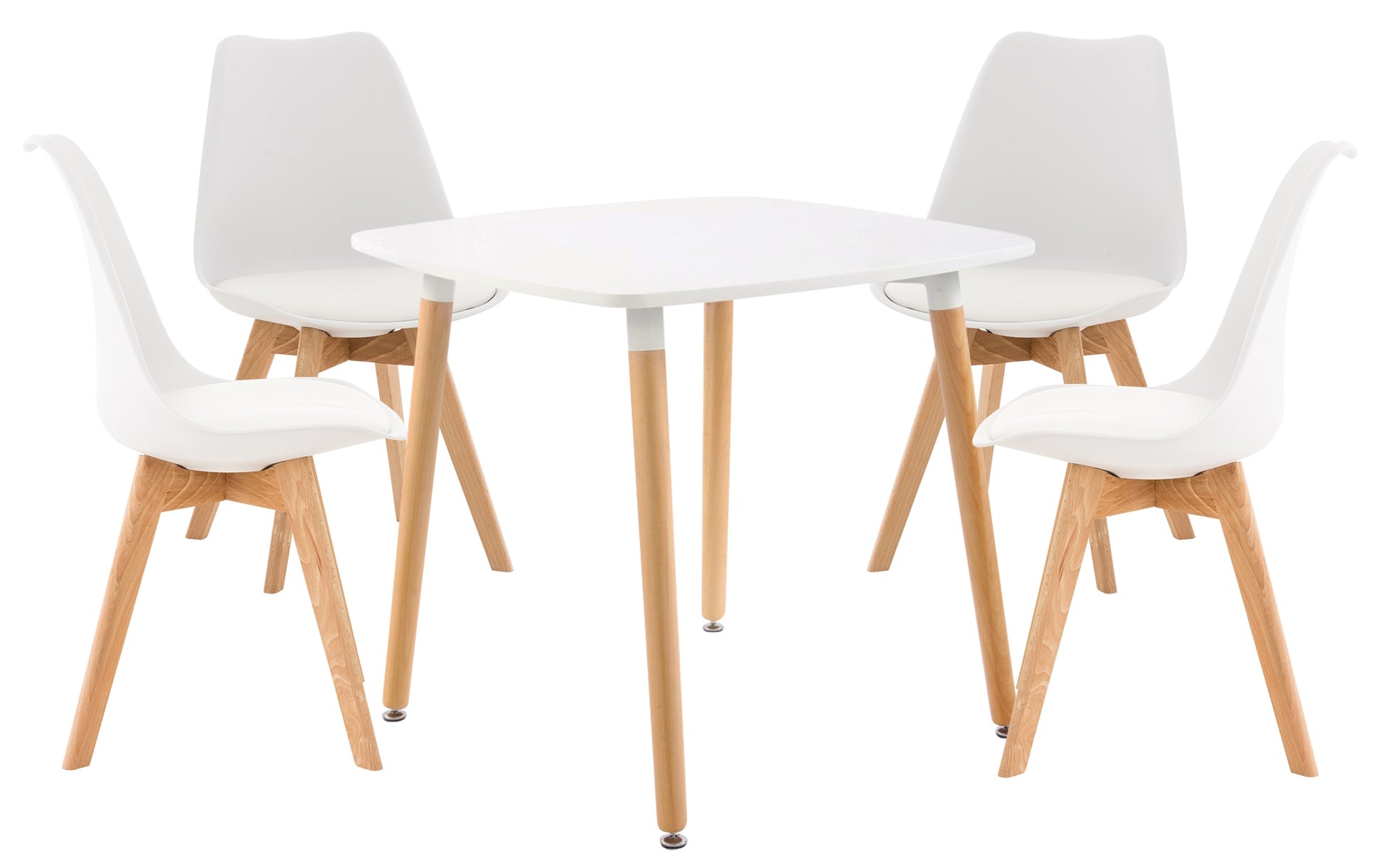 Optisch harmonieren die Applikationen aus Buchenholz an Tisch und Stühlen ideal miteinander, sodass sich ein stimmiges und modernes Gesamtbild ergibt.