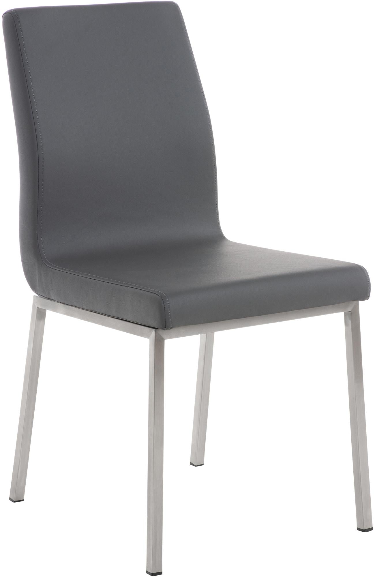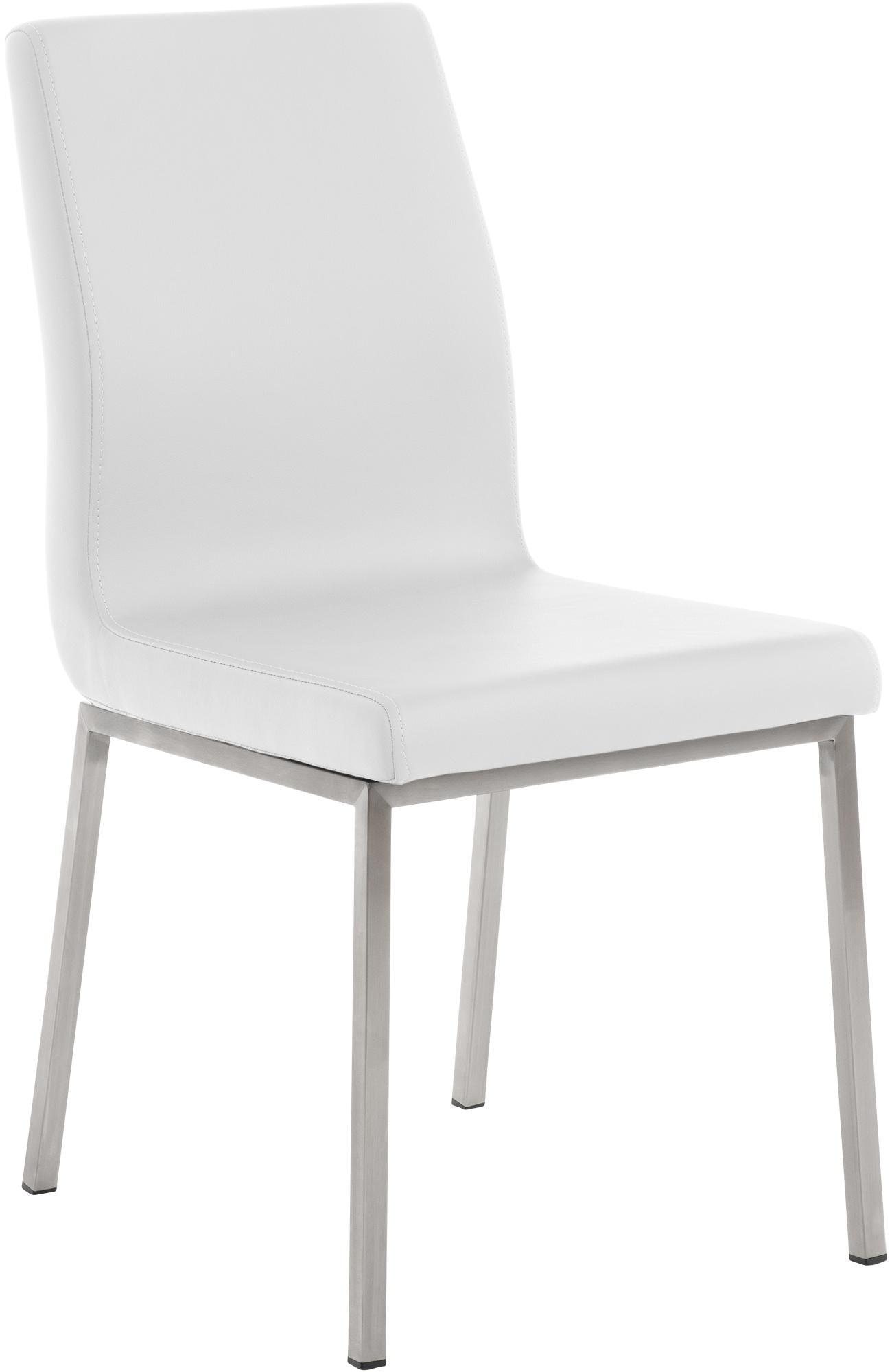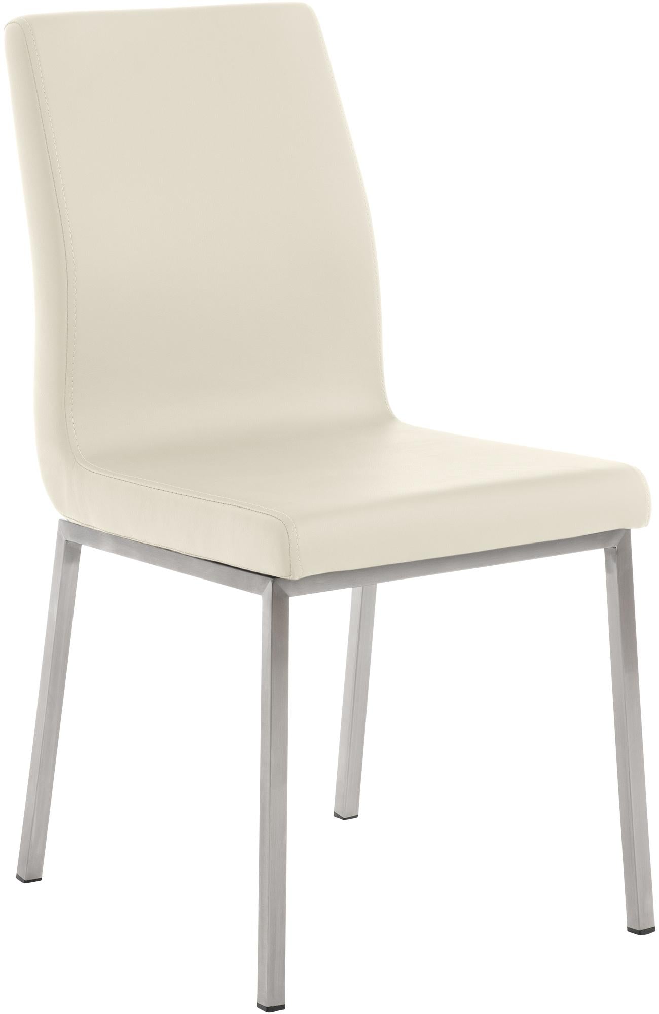 Der Esszimmerstuhl hat ein standfestes Vierfußgestell aus matt-gebürstetem Edelstahl. So kann der Stuhl Colmar bedenkenlos bis 120 Kilogramm belastet werden. Bodenschoner beugen dabei Beschädigungen empfindlicher Böden vor.