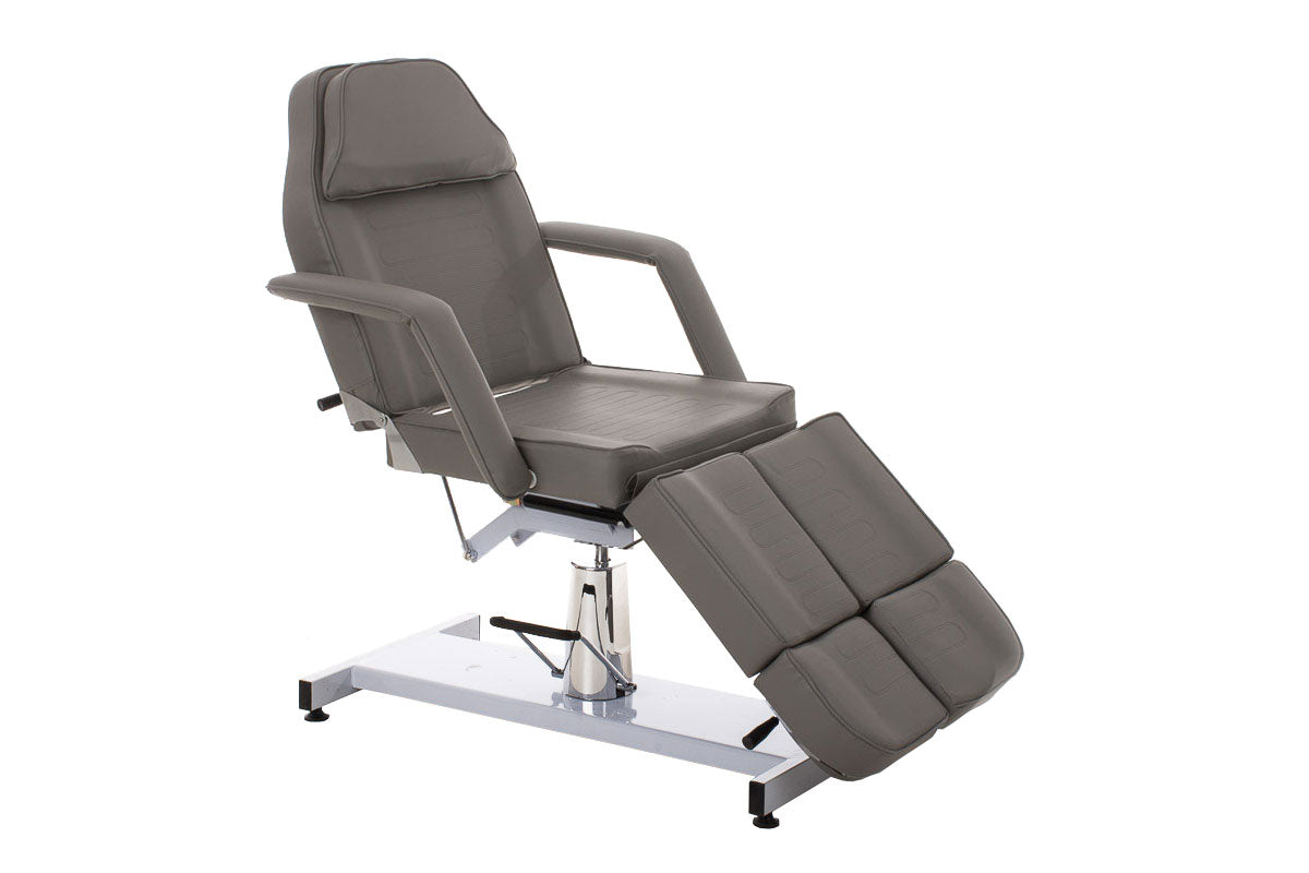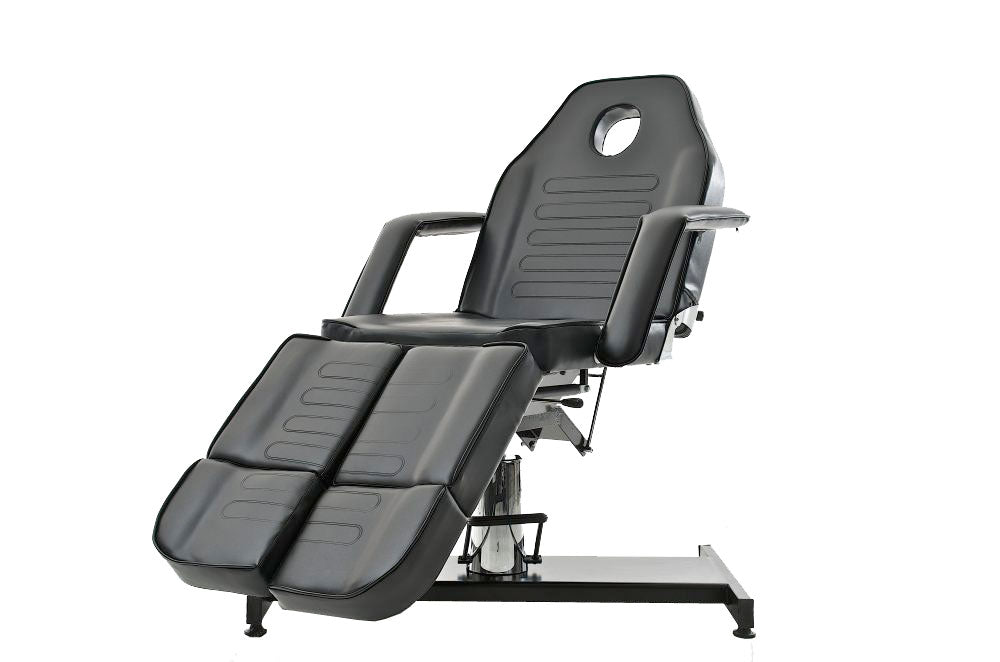 Hydraulische Kosmetikliege für Kosmetik- und Pediküre-Anwendungen. Diese Liege verfügt über ein geteiltes Fußteil, wodurch man optimal die Pediküre durchführen kann.