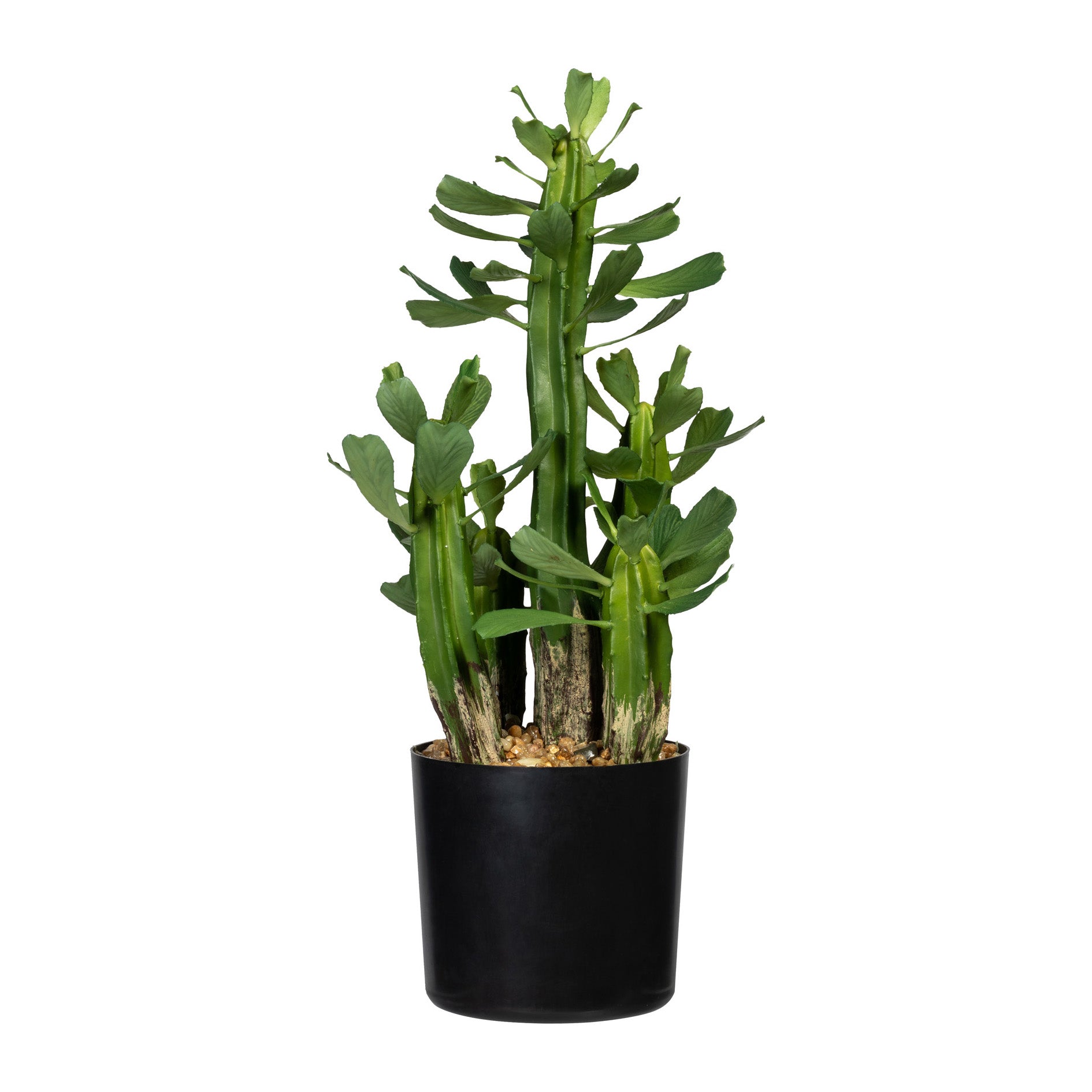 Die Euphorbie ist in einem schwarzen Kunststofftopf befestigt, und die Oberfläche ist mit Kies bedeckt, sodass das Aufstellen an jedem Ort problemlos möglich ist.