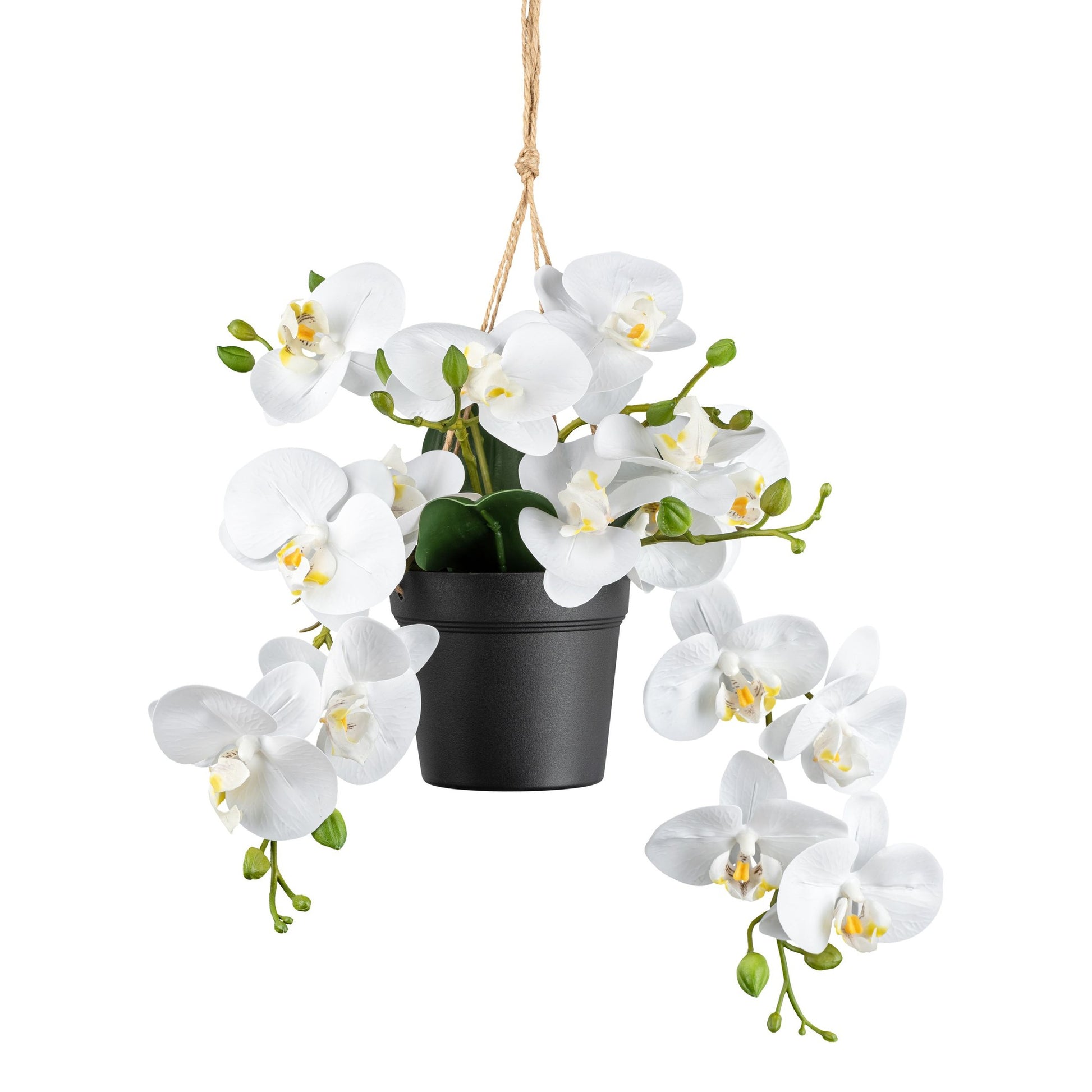 Bringen Sie einen Hauch von Eleganz in Ihr Zuhause mit unserer Phalaenopsis im Ampeltopf. Diese kunstvolle Nachbildung einer klassischen Orchidee bringt die zeitlose Schönheit der Phalaenopsis in Ihren Wohnraum, ohne dass Sie sich um die Pflege lebender Pflanzen kümmern müssen.