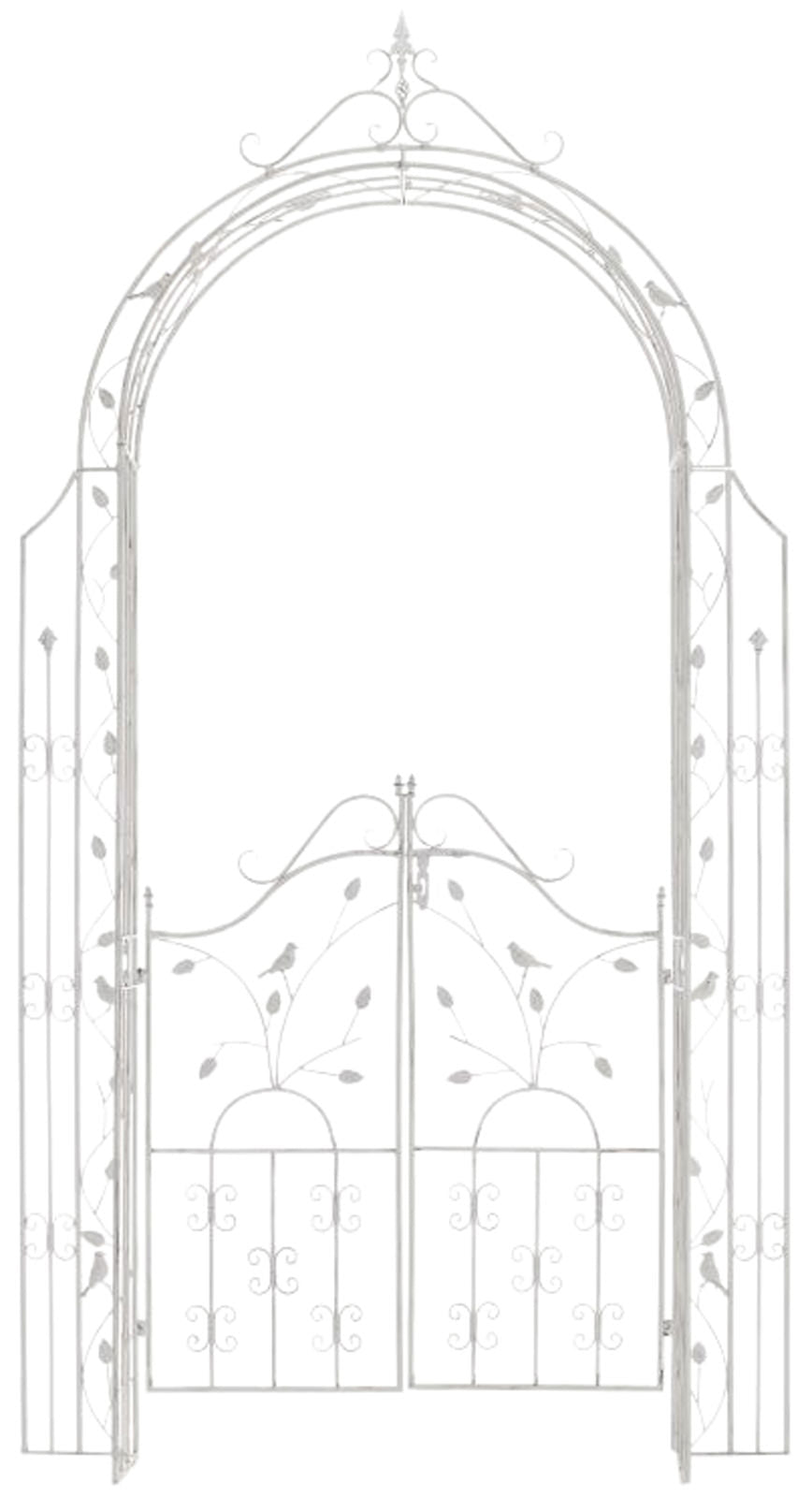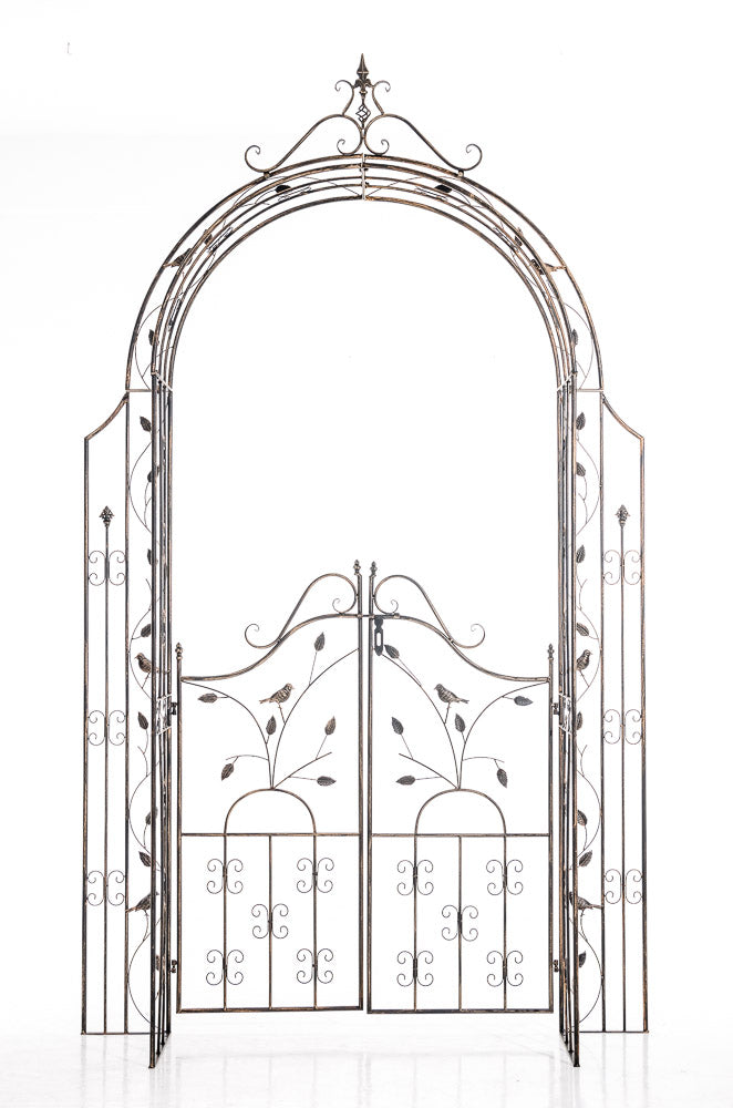 Unser exklusiver Rosenbogen Grenada mit Tor ist liebevoll mit vielen Details verziert und eignet sich daher perfekt als Rankhilfe für Efeu und andere Kletterpflanzen. Aber auch freistehend ist dieser Rosenbogen mit den beiden verschließbaren und wunderschön verzierten Torflügeln ein Blickfang in jedem Garten.