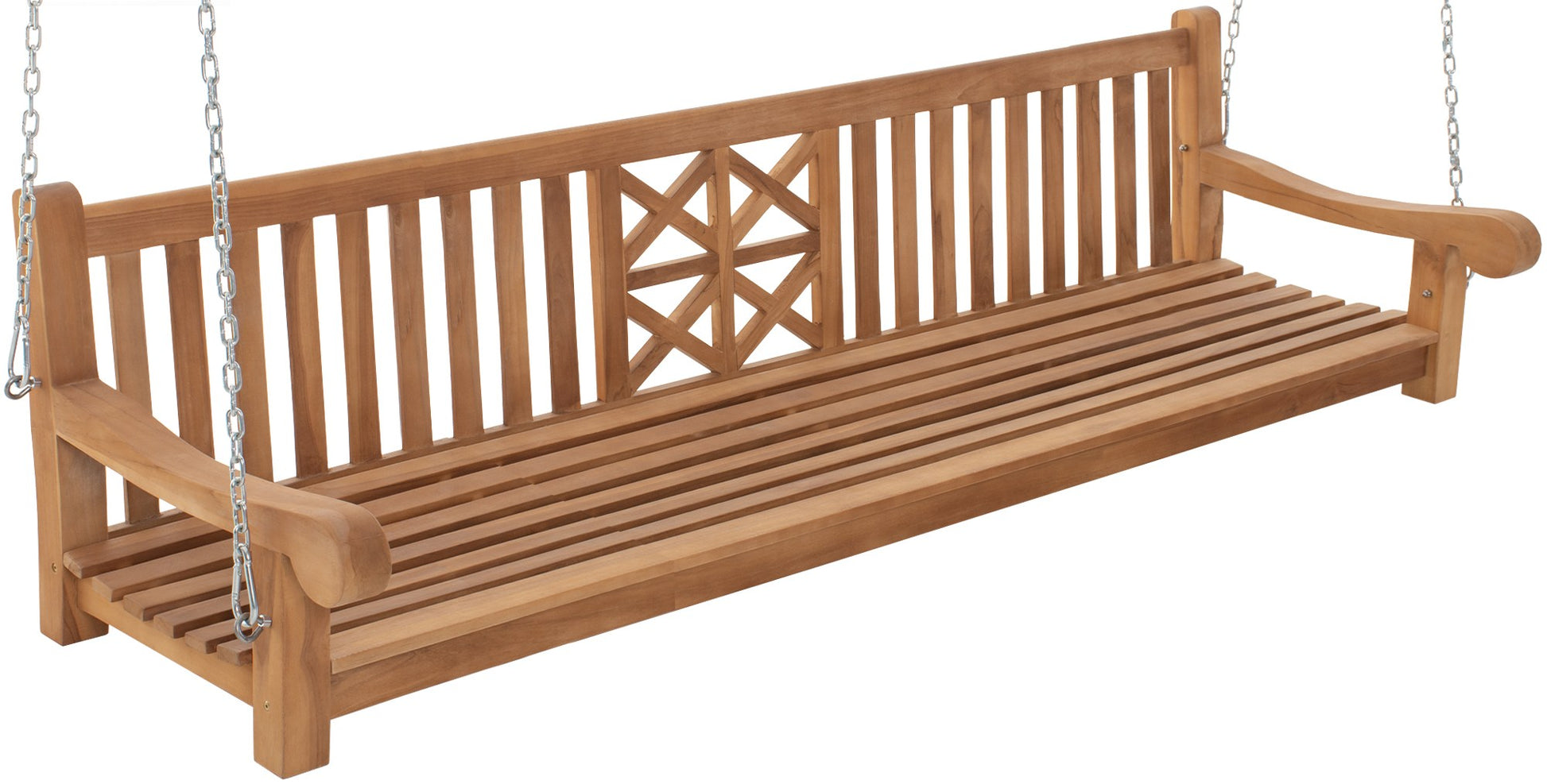 Die Gartenschaukel sieht mit dem schlichten Äußeren und der goldbraunen Farbe des Teakholzes schick aus und kann mit einer Vielzahl unterschiedlicher Einrichtungsstile kombiniert werden. Die Bank eignet sich ideal zum Entspannen. Sitzbereich und Rückenlehne sind leicht gewölbt, sodass die Sitzbank auch ohne Polster bequem ist. An den Seiten ist die Teakbank außerdem mit Armlehnen ausgestattet.