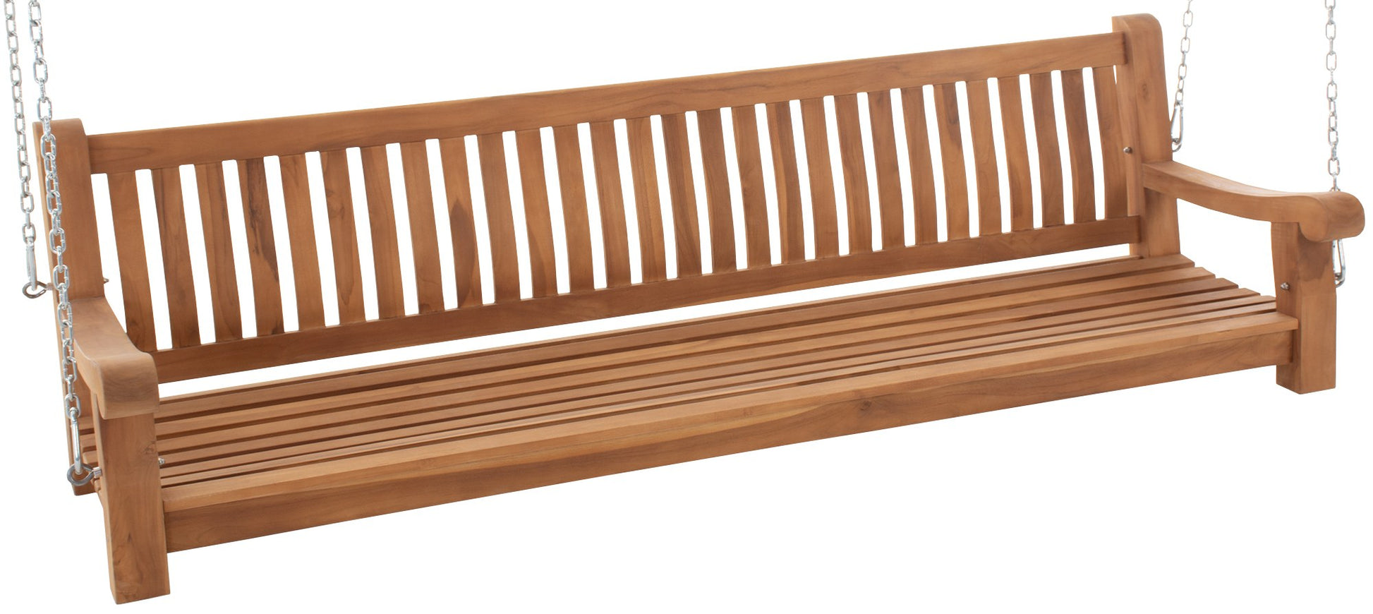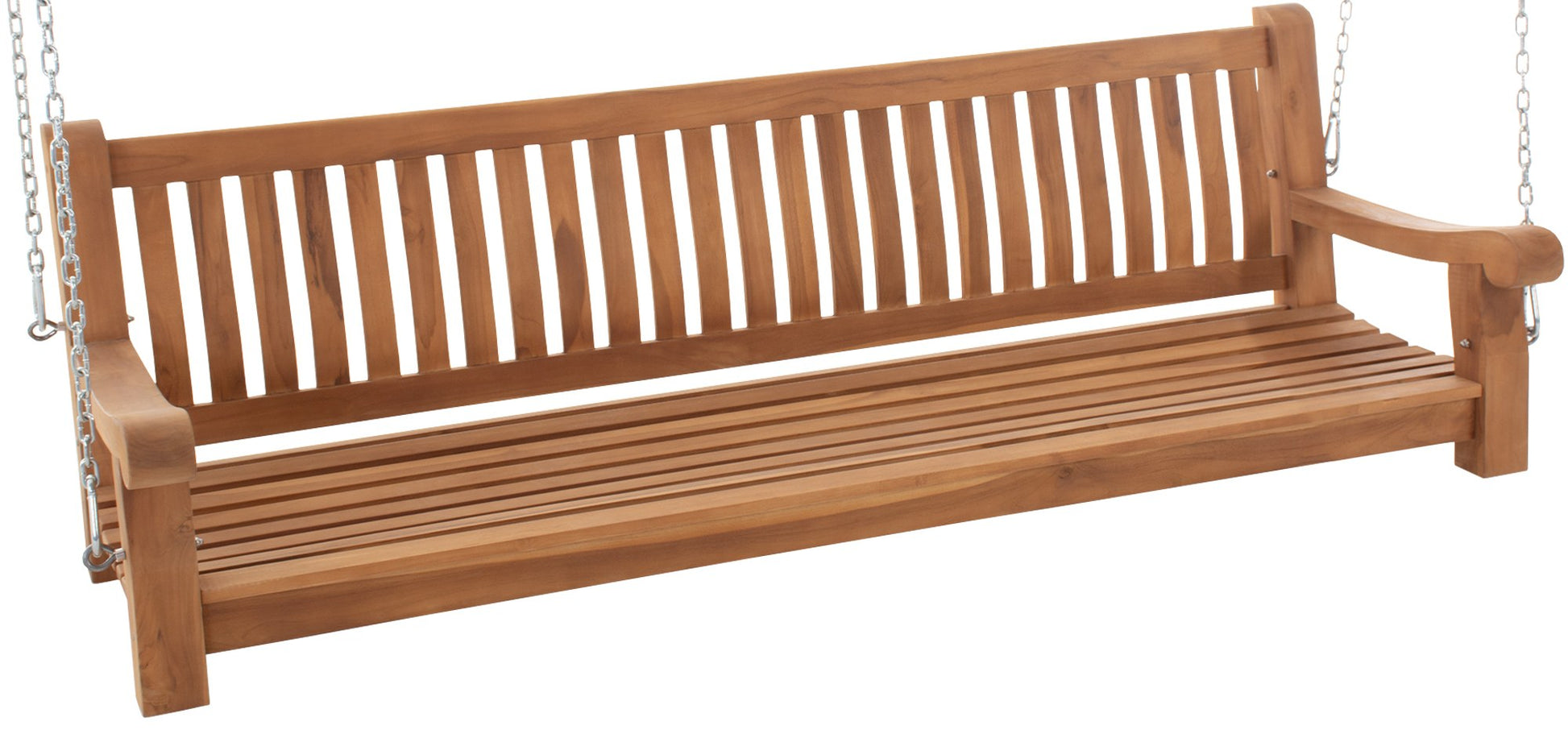 Die Gartenschaukel sieht mit dem schlichten Äußeren und der goldbraunen Farbe des Teakholzes schick aus und kann mit einer Vielzahl unterschiedlicher Einrichtungsstile kombiniert werden. Die Bank eignet sich ideal zum Entspannen. Der Sitzbereich ist leicht gewölbt, sodass die Sitzbank auch ohne Polster bequem ist. An den Seiten ist die Teakbank außerdem mit Armlehnen ausgestattet.