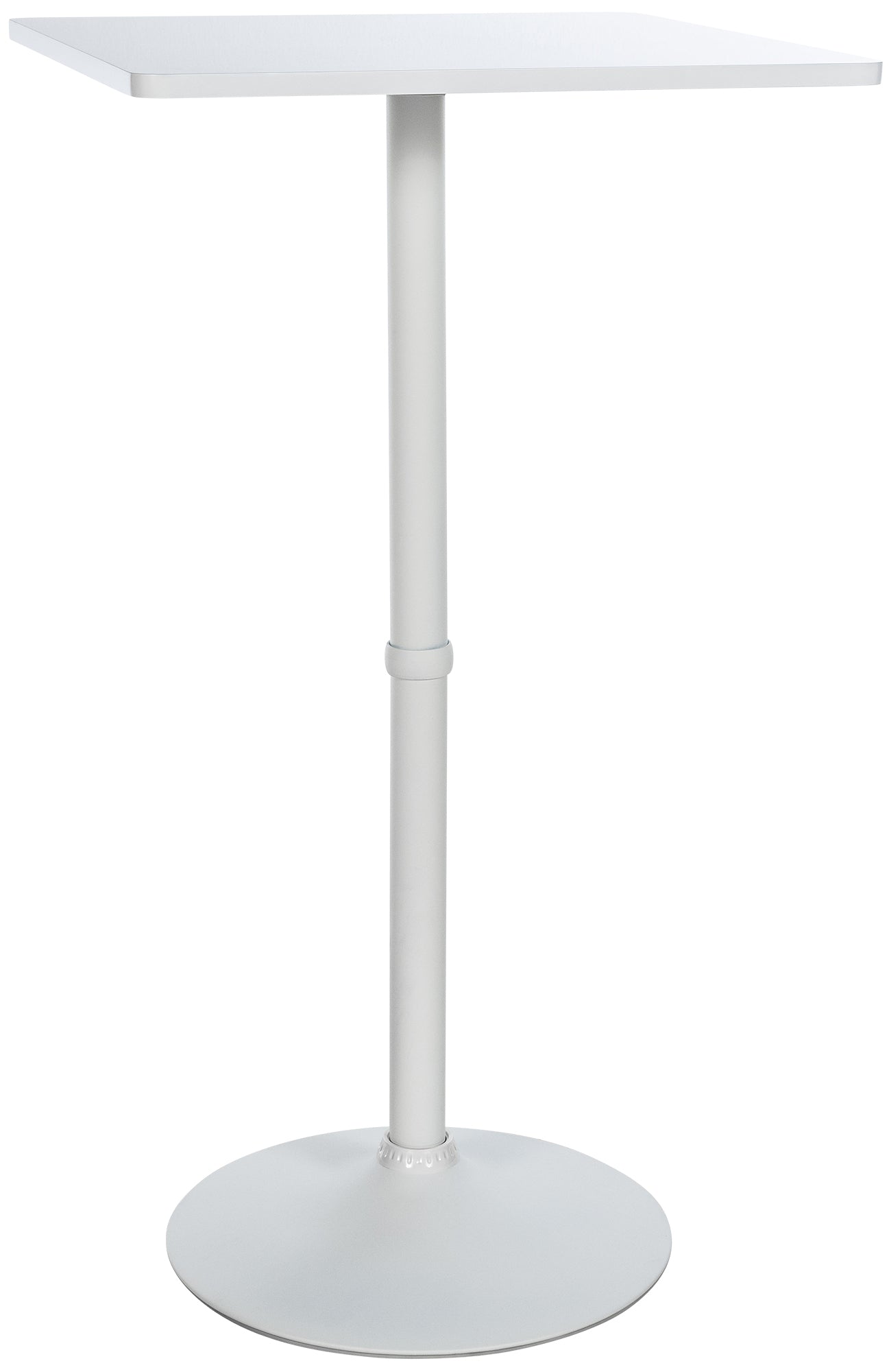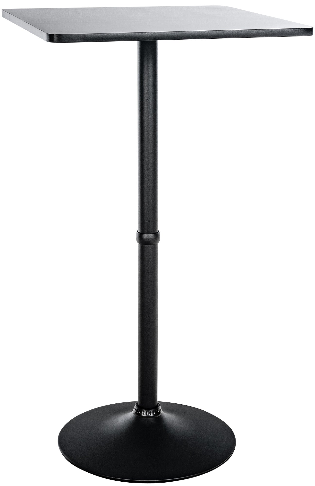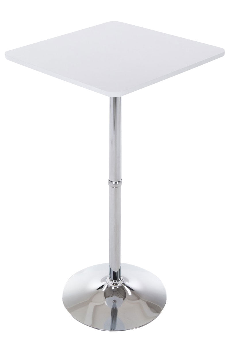 Der eckige Tisch steht standsicher auf einer robusten Fußplatte. Die quadratische Tischplatte bietet mit ihren 60 x 60 cm Platz für gut vier Personen. Die Höhe dieses Stehtisches ist kompatibel zu vielen gängigen Barhocker.