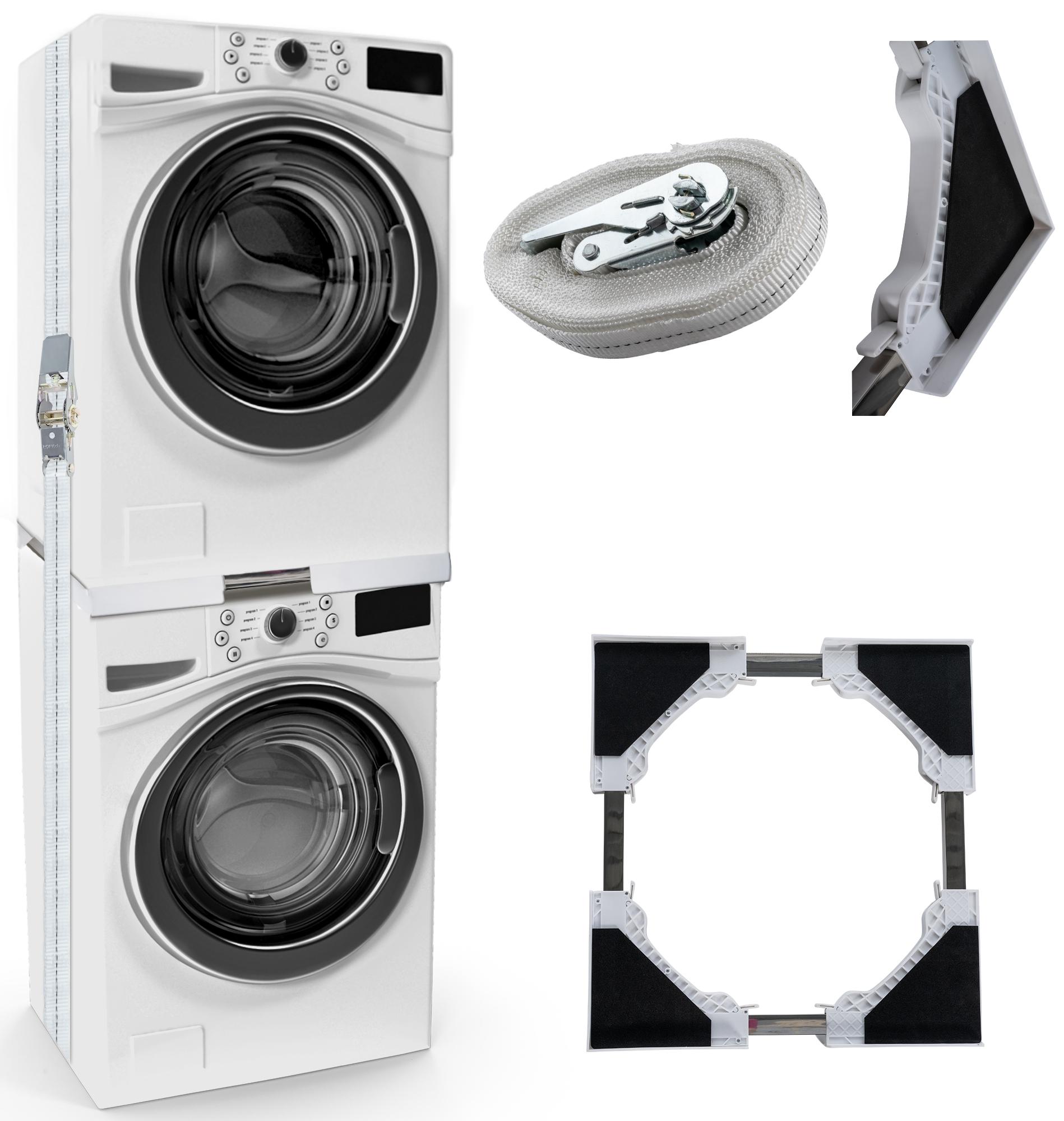 Der Zwischenbaurahmen besteht aus kaltgewalztem Stahl und ist mit Schonern versehen. Ebenfalls praktisch ist, dass im Lieferumfang ein Spanngurt enthalten ist, mit dem die übereinander gestapelten Geräte fixiert und gesichert werden können. Dadurch ist dieses Waschmaschinen-Zubehör sehr stabil und Ihre Geräte werden nicht beschädigt.